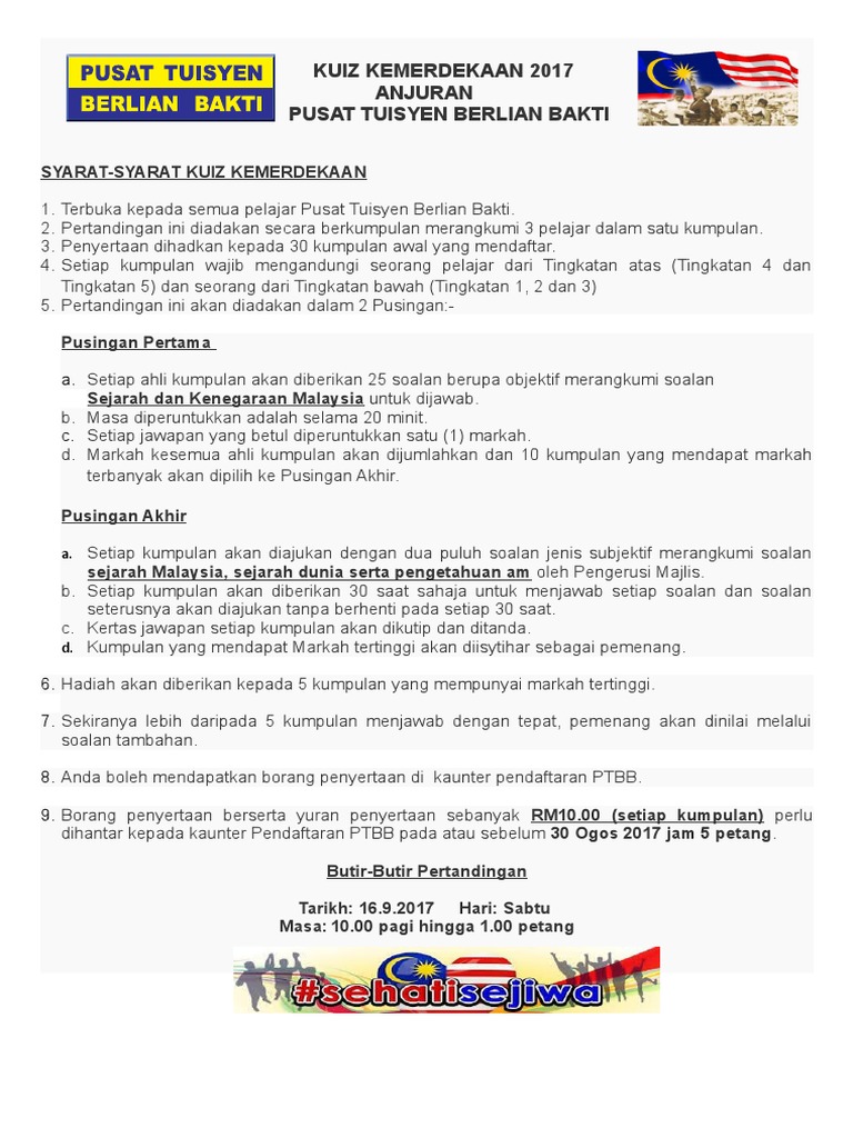 Kuiz Kemerdekaan Dengan Jawapan 2017 : Litrak / Ilustrasi kuiz merdeka ini dipetik dari laman web berikut :. 2017 (5204) december (370) november (360) october (569) september (720). Sep 6, 2017 | total attempts: Brosur hari guru via preschoolskj11.blogspot.com. Kuiz kemerdekaan dengan jawapan jenis kabel bawah tanah kertas kerja perkhemahan unit beruniform sekolah menengah hiasan gerai jamuan hari raya house loan interest rate malaysia 2019 doa belajar dan maksudnya hari kanak kanak 2019 gaji bulan oktober 2019 drama isteri vs tunang Tun dr mahathir bin mohamad.
